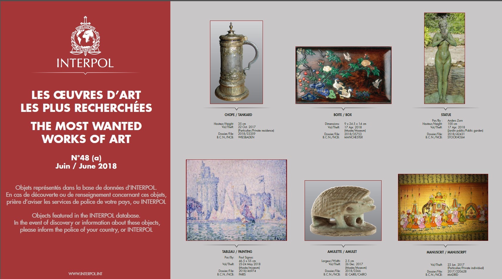 Most Wanted Works of Art Zurück zu: Startseite Fahndung Most Wanted Works of Art Interpol Poster Juni 2018 BeschreibungInterpol Poster Juni 2018 Termine Samstag, 21. März 2026 Wien Recruitingday on Tour Samstag, 28. März 2026 Wien Kinderpolizei Aufnahmen Fun4Kids 2026 Samstag, 11. April 2026 Wien Meet and Greet mit Polizeischülern Donnerstag, 23. April 2026 Wien Girl's Day Donnerstag, 23. April 2026 Tirol Hommage 2026 zu den Terminen
