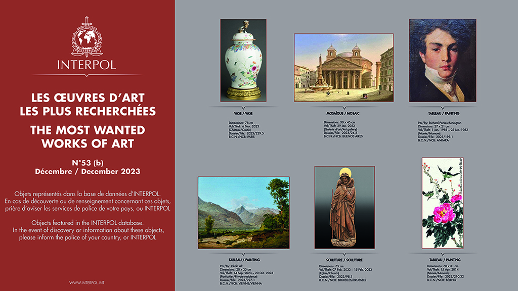 Most Wanted Works of Art Zurück zu: Startseite Fahndung Most Wanted Works of Art Interpol Poster Dezember 2023 Termine Samstag, 21. März 2026 Wien Recruitingday on Tour Samstag, 28. März 2026 Wien Kinderpolizei Aufnahmen Fun4Kids 2026 Samstag, 11. April 2026 Wien Meet and Greet mit Polizeischülern Donnerstag, 23. April 2026 Wien Girl's Day Donnerstag, 23. April 2026 Tirol Hommage 2026 zu den Terminen