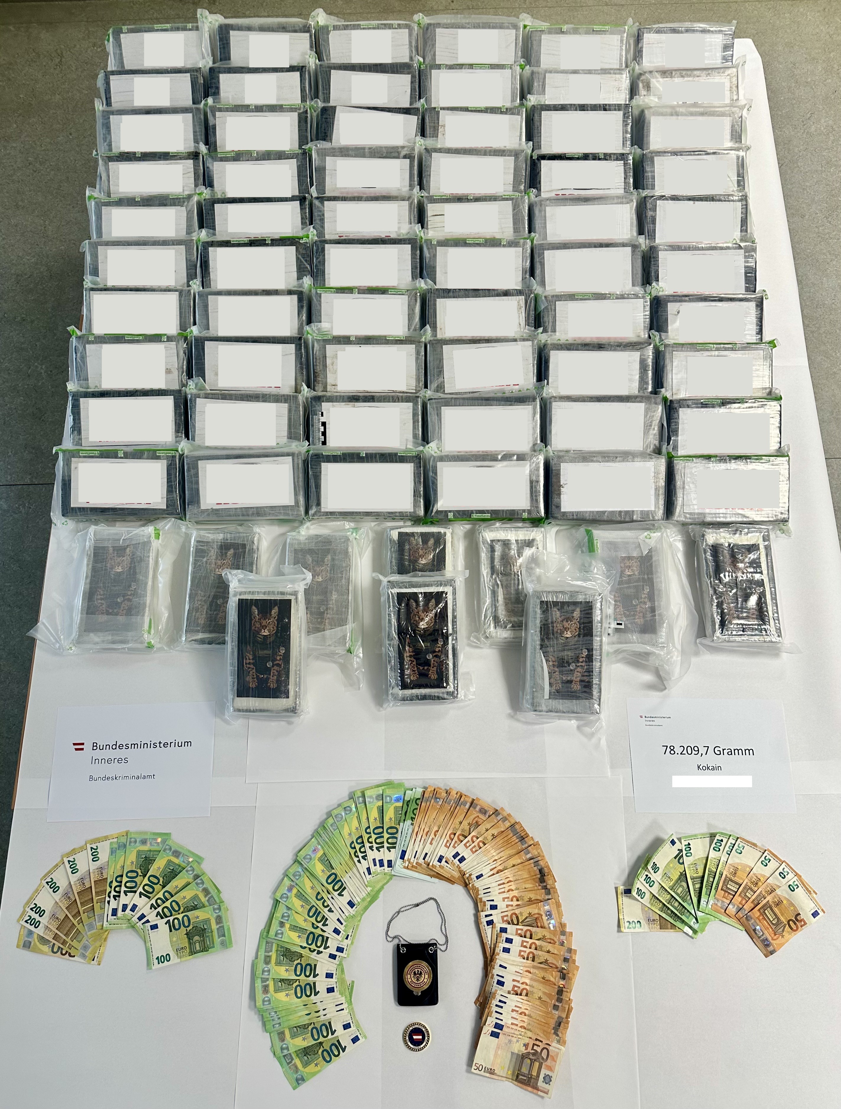 Bei weiterführenden Ermittlungen konnten am 1. April 2025 im Bezirk Bruck an der Leitha bei der Durchsuchung des Arbeitsplatzes des Beschuldigten weitere 3.089,9 Gramm Kokain sichergestellt werden