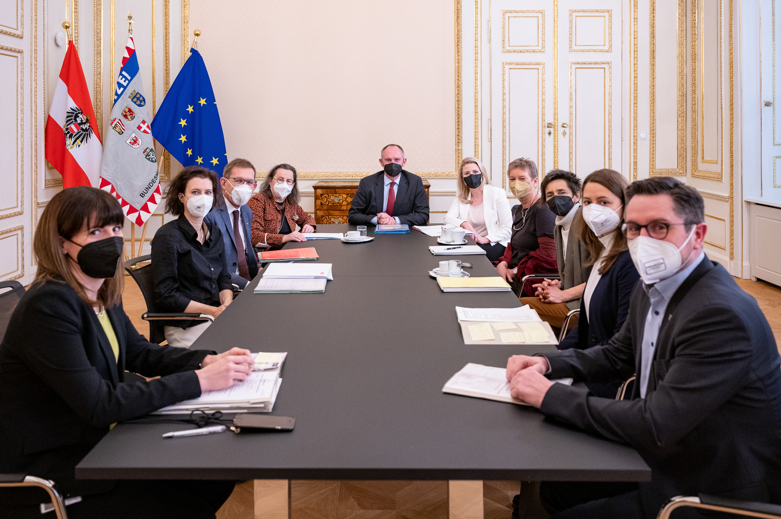 Bei dem Austausch berieten sich Rosa Logar (Wiener Interventionsstelle), Barbara Jauk (Bundesverband der Gewaltschutzzentren) und Christoph Koss (Verein Neustart – Beratungsstellen für Gewaltprävention) mit Innenminister Karner, Frauenministerin Raab sowie dem stellvertretenden Direktor des Bundeskriminalamtes Manuel Scherscher.